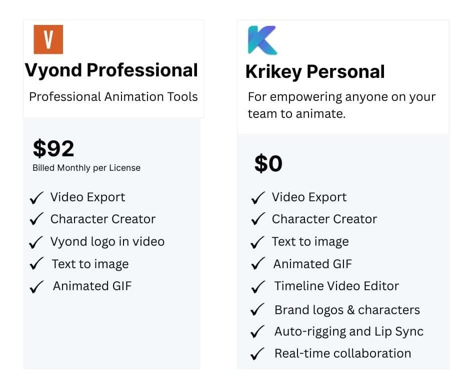 ✅ Vyond comparison: Krikey AI offers more export format flexibility, including 3D model files (FBX) that Vyond doesn't support.